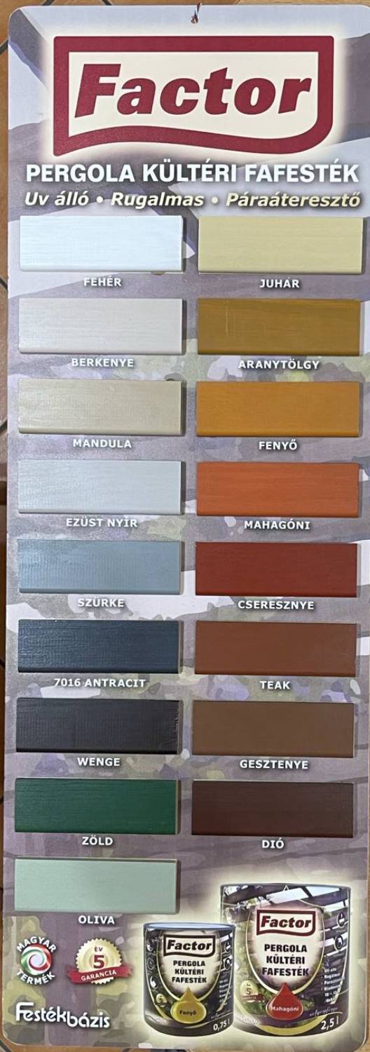 Garancia: A Festék Bázis Zrt. (továbbiakban: Gyártó) jótállást vállal a Factor Pergola Kültéri Fafestékre, a vásárlás időpontjától számított 5 évig, a Polgári Törvénykönyv fogyasztói szerződésekre vonatkozó rendelkezései alapján. Az önként vállalt jótállási idő alatt felmerülő, fogyasztói kifogás elbírálását a Gyártó kirendelt szakértői vizsgálathoz köti, mivel a termék felhasználásának körülményeire nincs rálátása.